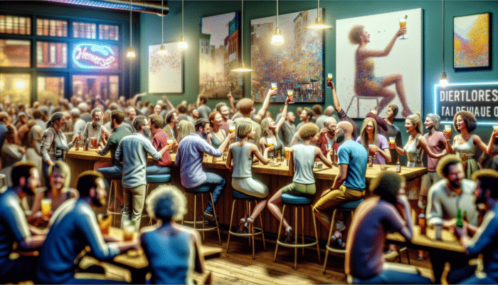 Best Day Drinking Bars in Henderson: A vibrant downtown bar scene with local art, lively patrons, and community events.